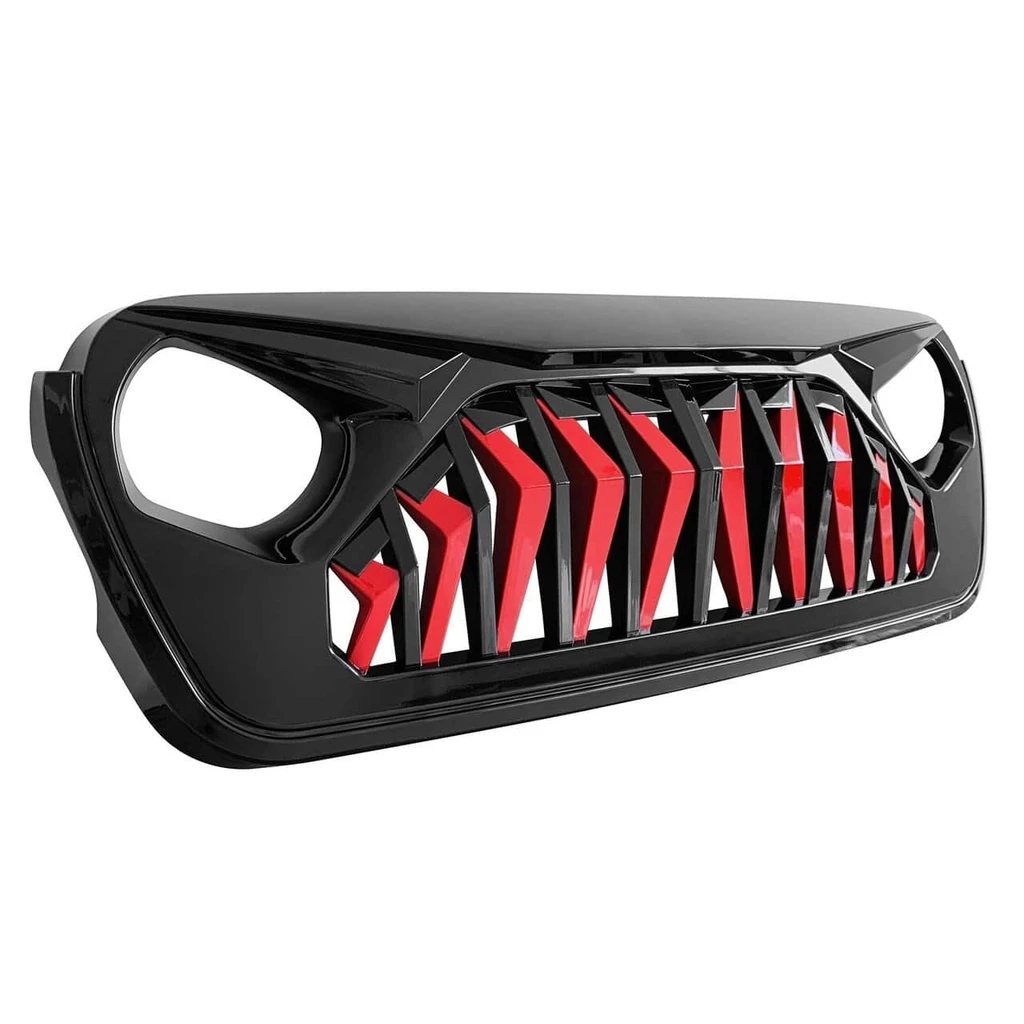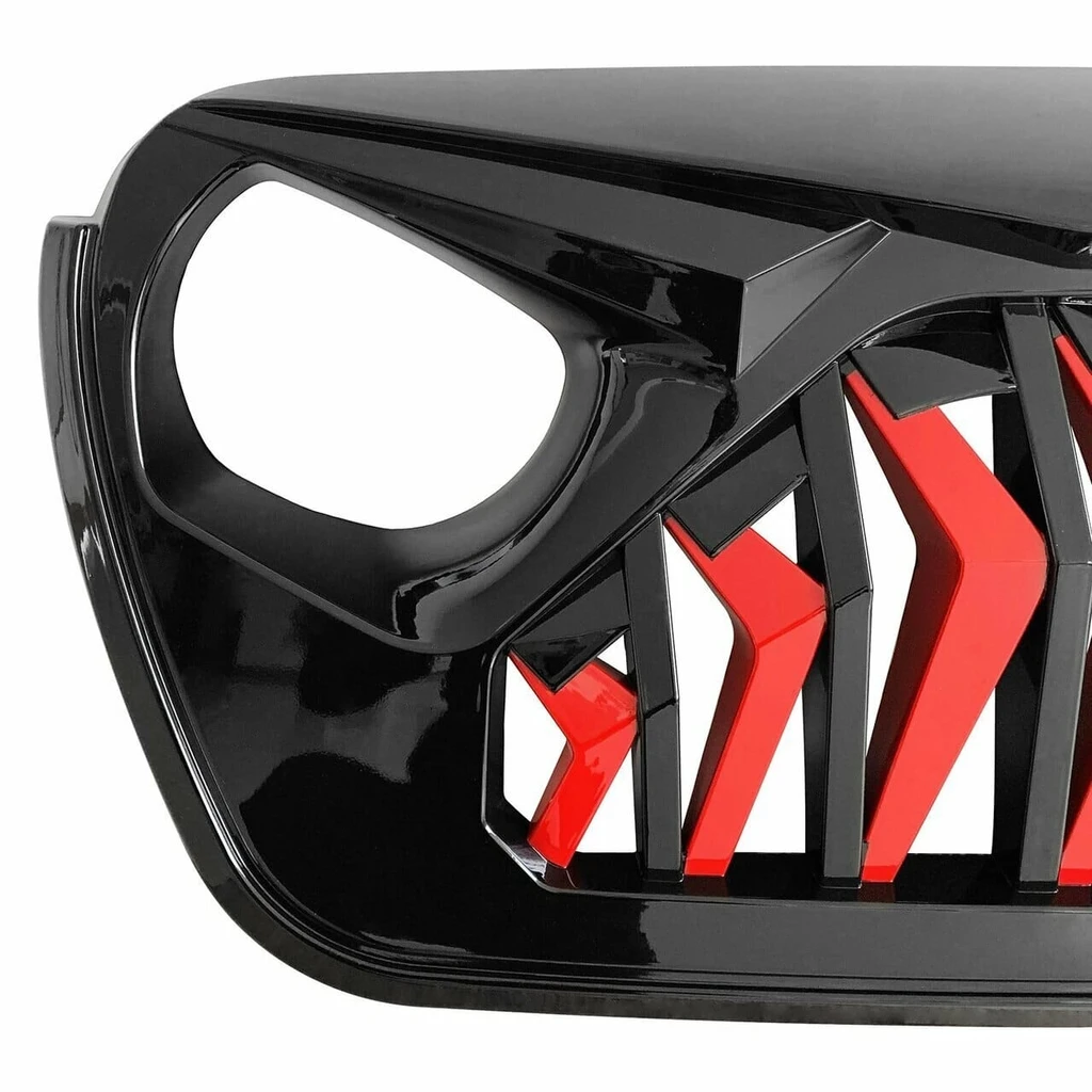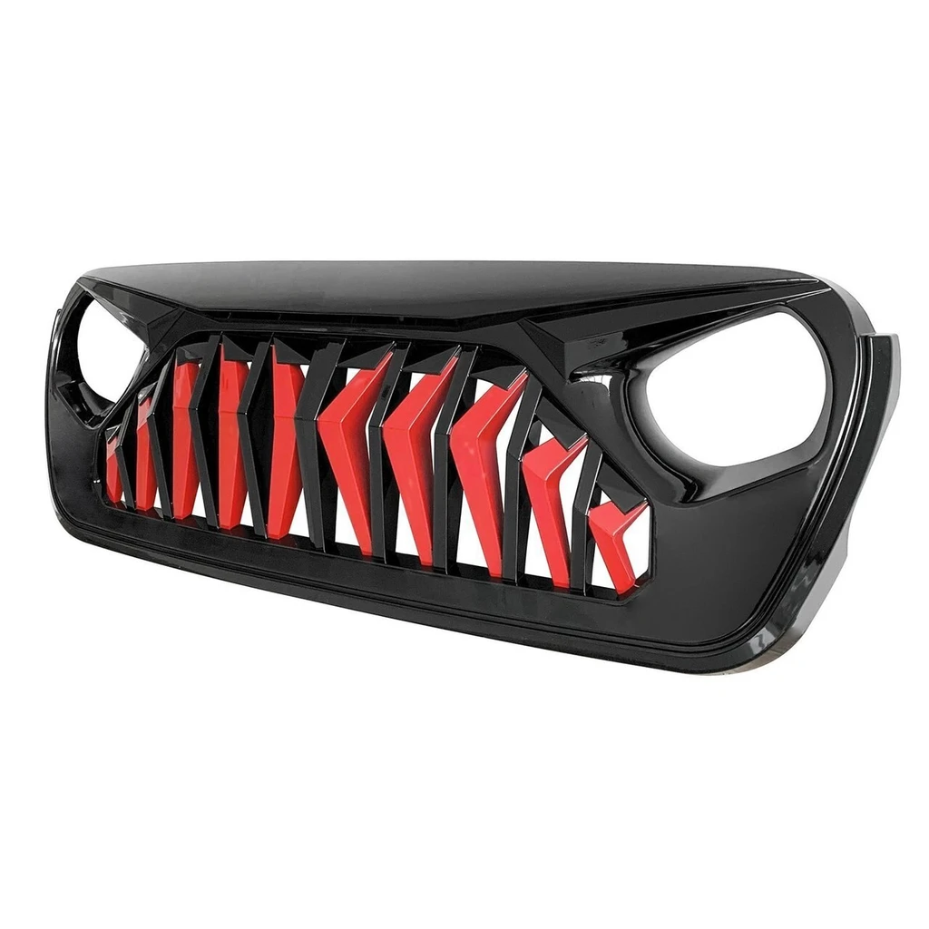 Unique Grille Upgrade. If you want a unique look and well-constructed front grille for your 2018-2020 Jeep Wrangler JL JT Gladiator, Our Shark Grille in Glossy red&black is a perfect choice. It's simple to install and instantly upgrades the look of your Jeep, thanks to its unique design. This Shark grille features an eagle eye look, aggressive open grille and cutouts for headlights and turn signals.
