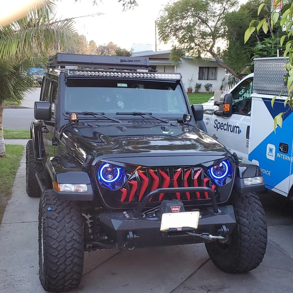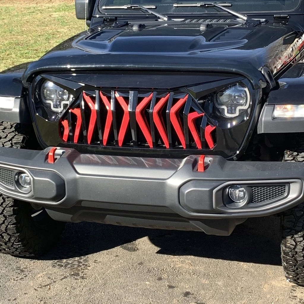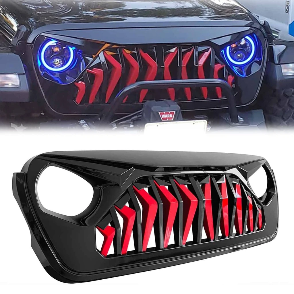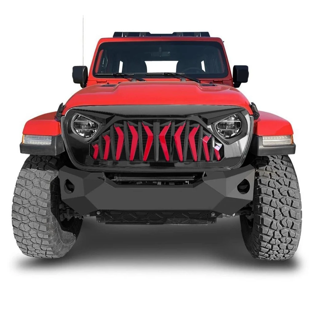 Unique Grille Upgrade. If you want a unique look and well-constructed front grille for your 2018-2020 Jeep Wrangler JL JT Gladiator, Our Shark Grille in Glossy red&black is a perfect choice. It's simple to install and instantly upgrades the look of your Jeep, thanks to its unique design. This Shark grille features an eagle eye look, aggressive open grille and cutouts for headlights and turn signals.