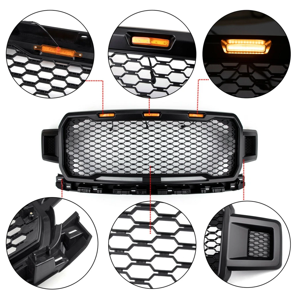 Clearance Fit 2018 2019 Ford F150 Raptor Style Front Grille Honeycomb Mess Grill W-LED